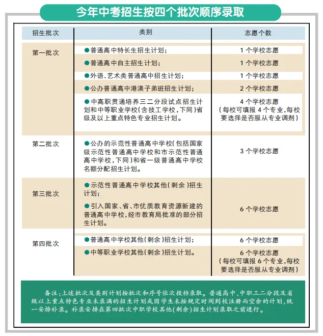 第一批次(特长生-自主招生-外语艺术类-港澳子弟班-中职三二分段或省重点专业)——第二批次——第三批次——第四批次普通高中——补录(重新填报志愿)——第四批次中职学校。