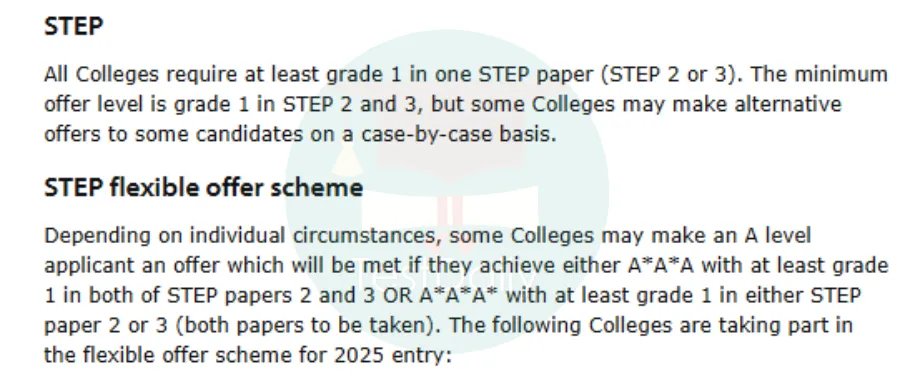 STEP是Sixth Term Examination Paper的缩写,直译为“第六学期考试”,是一项由剑桥评估国际教育组织并被广泛认可的高等数学能力测试,它旨在挑战并精准衡量学生的高级数学知识和复杂的逻辑推理技能。STEP考试内容通常超越了常规A-level课程的标准,为那些对数学有浓厚兴趣且具备超凡才能的学生提供了一个展示其深度理解与创新能力的平台。这是为测试申请者数学能力而举行的笔试,学生需要在大学入学的前一年参加该考试。自2024年起,OCR考试局代替原本的剑桥大学入学考试委员会(CAAT),组织实施STEP考试。图片来源:https://www.cam.ac.uk/剑桥大学对申请数学本科的学生要求必须参加STEP考试并达到指定成绩。如帝国理工学院(ICL)、华威大学(Warwick)等也接受STEP成绩作为申请条件或额外加分项。尽管牛津大学数学、计算机相关专业不要求提供STEP成绩,但牛津官网上也明确建议申请者参加STEP考试。图片来源:https://www.cam.ac.uk/STEP考试每年6月中下旬进行(与A Level考试时间接近),以纸考的形式进行,通常分为以下两份试卷:STEP 2(3小时):内容基于 A Level数学与进阶数学;