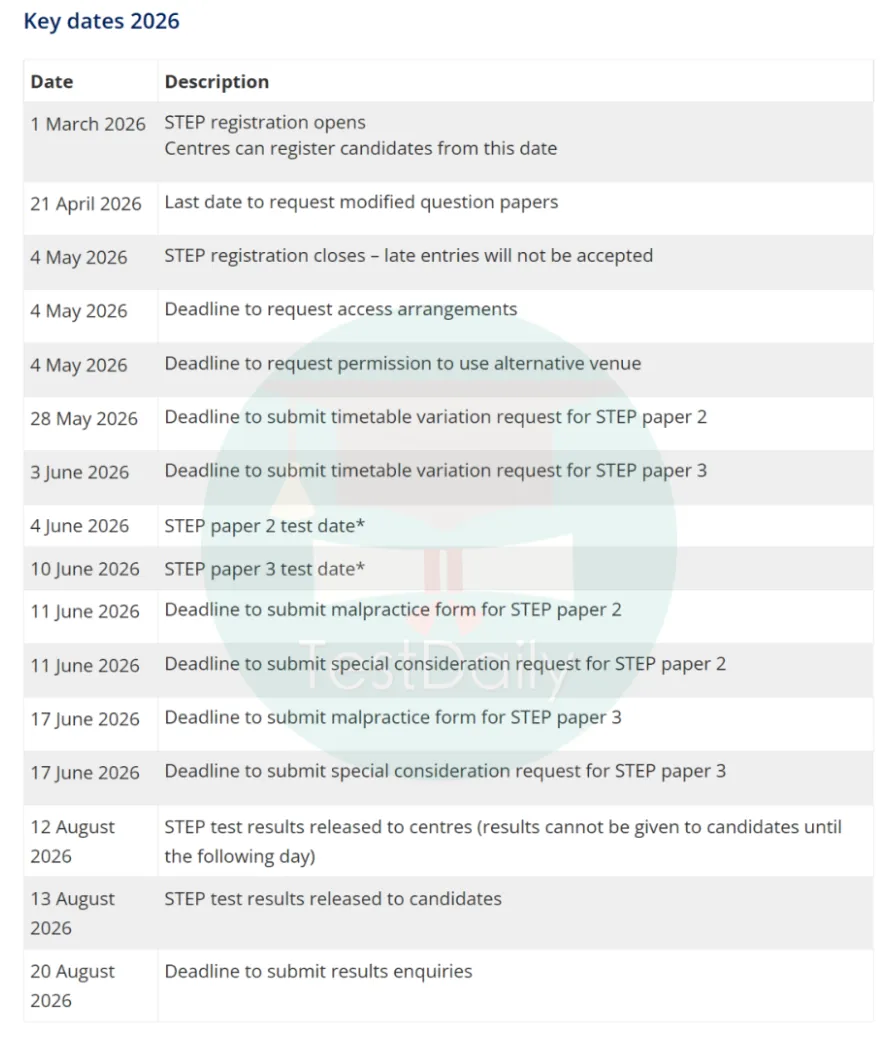 剑桥大学数学专业通常要求考生在STEP 2和STEP 3中至少达到 1级 或更高的成绩。申请修改试卷格式的截止日期(视力不佳的学生提交证明后可以申请加大号字体试卷)图片来源:https://www.ocr.org.uk/administration/step-mathematics/key-dates-and-fees/特别提醒:STEP考试时间可能与A Level相关考试时间冲突,请提前做好相关考试安排。- 考生所在学校是授权考试中心,则可通过学校报名和参加STEP考试。