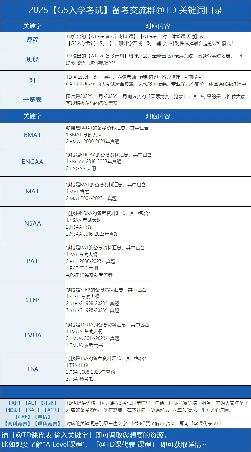 看到这里,一定有很多同学都在疑惑,英国G5数学类相关专业入学考试还有MAT、TMUA等,那么,大家究竟要如何选择,下面,我们来重点看一下这三类考试的主要区别:难度最高,重点考查学生对A Level数学及高等数学内容的深度掌握和复杂问题的解决能力。STEP更多关注学生能否适应大学数学课程的高要求,成绩通常作为条件录取的一部分,主要用于剑桥、帝国理工和华威大学。考试时间安排在A Level结束后,和A Level成绩一起决定录取资格。MAT由牛津大学开发,旨在申请初期评估学生的数学潜力和逻辑推理能力,适用于牛津、帝国理工、华威等大学。难度比STEP低,考题更加简洁,主要用于筛选出是否进入面试的候选人。考试时间较早,和UCAS申请时间(10月15日)接近,便于大学快速决定面试资格。TMUA更偏向逻辑推理和数学理解,难度相对较低,考试内容更基础,适合作为申请的补充证明。TMUA成绩常用于华威、LSE和杜伦等大学,但通常不是必需项,时间安排与MAT类似,方便在申请早期筛选候选人。总结下来,MAT/TMUA在申请初期(10月底或11月初)进行,更注重申请早期的筛选需求,而STEP在A Level后(6月)进行;更聚焦高难度测试,STEP在考试难度上是最大的,用于评估同学们是否适合大学阶段的数学学习。因此,在这三类考试的选择上,大家也需要综合自身学术能力和所申院校的具体要求来评估。STEP考试是申请英国顶尖大学数学专业很重要的一环,虽然考试难度极大,但通过系统的备考和合理的规划,很多的同学也是能够在这场考试中脱颖而出,希望这篇文章对想要冲刺英国各大名校的同学有所帮助。文案:为了满足同学们G5入学考试的备考需求,TD整理了G5入学考试备考资料合集,囊括MAT、PAT、STEP、TMUA、TSA、BMAT、ENGAA、NSAA等主流考试的备考资料,包含历年真题、大纲以及参考用书,全方面助力备考。扫描下方二维码添加小马甲微信回复关键词「G5入学考试」进入【G5入学考试】备考交流群,即可领取全新升级的备考干货资料~