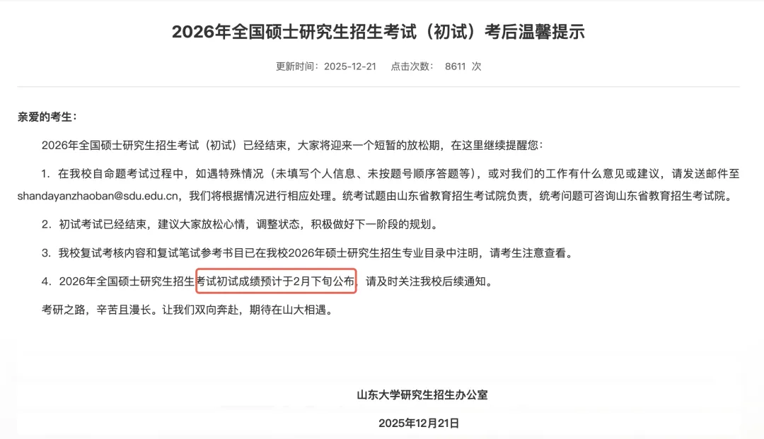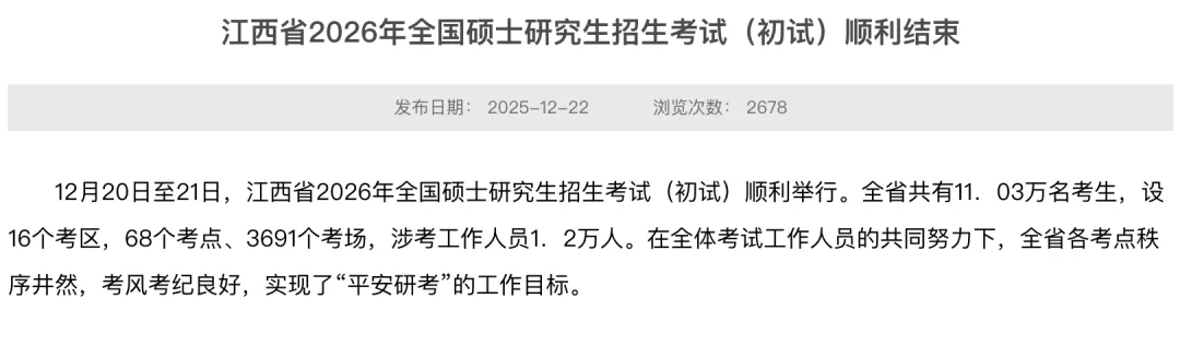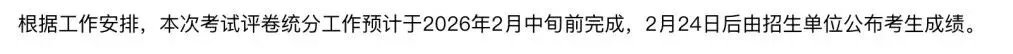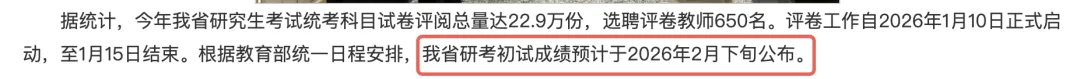 评卷工作自2026年1月10日正式启动,至1月15日结束。根据教育部统一日程安排,我省研考初试成绩预计于2026年2月下旬公布。