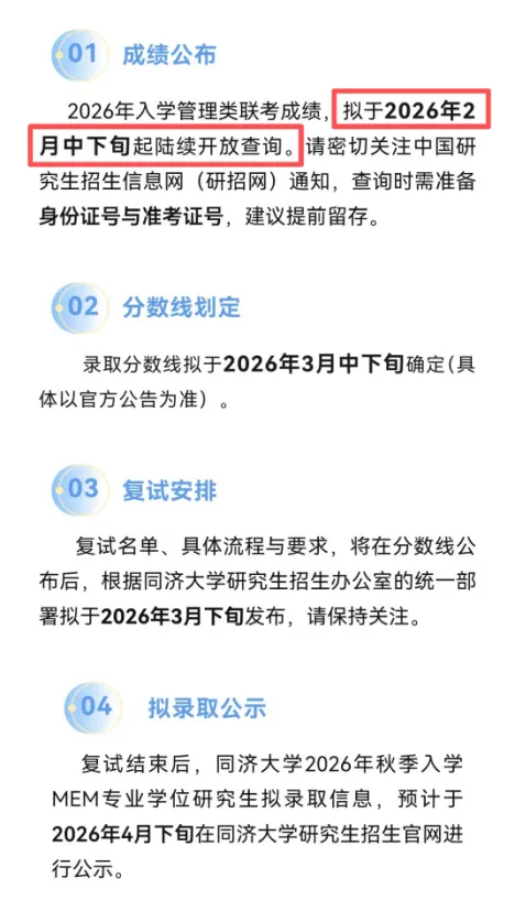 同济大学针对管理类联考考生明确时间安排,2026年入学管理类联考成绩拟于2月中下旬起陆续开放查询。