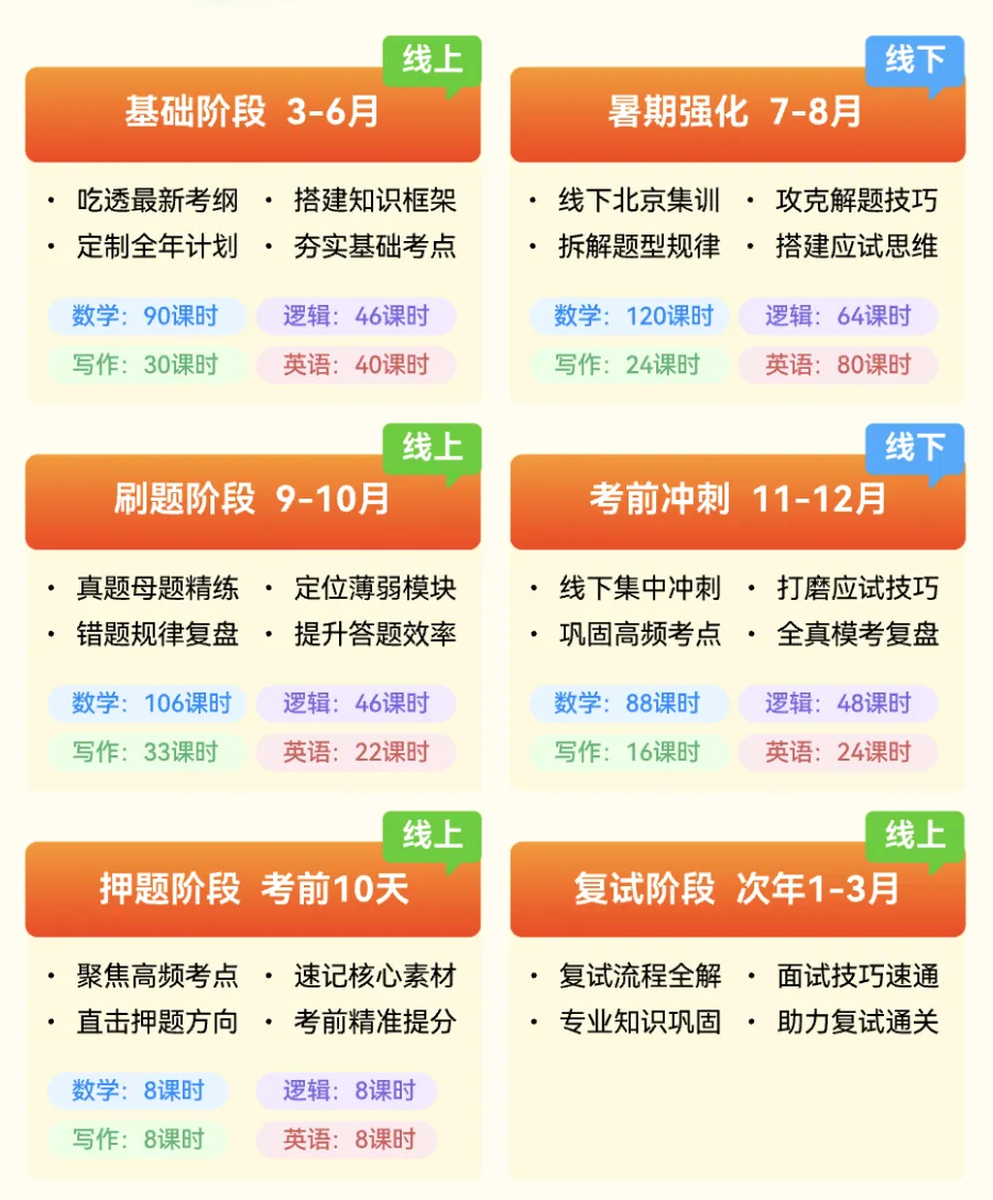 线上名师亲授课程+线下北京封闭集训,分阶科学规划,踩准备考黄金节奏