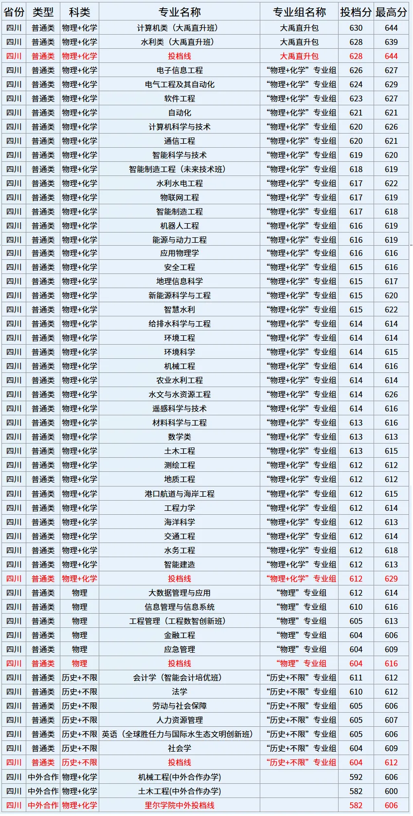 102组含“计算机类、水利类”2个“大禹直升班”专业,“大禹直升班”实施本研贯通培养模式,采用3+1+X的学制,再选科目要求为“化学”,录取分数为628,排名9704位次,该班型录取位次首次进入万位以内;
