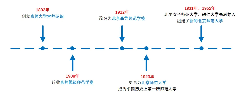 学校的前身是1902年创立的京师大学堂师范馆,1908年改称京师优级师范学堂,独立设校,1912年改名为北京高等师范学校。1923年学校更名为北京师范大学,成为中国历史上第一所师范大学。1931年、1952年北平女子师范大学、辅仁大学先后并入北京师范大学。