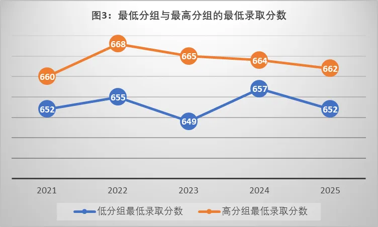 最高录取线在物化绑定前(2021~2023年)出现在“05历史/地理”专业组,该专业组只有一个专业——历史。物化绑定后(2024、2025年)出现在“04思想政治”专业组,该专业也只有一个专业——政治学、经济学与哲学。北京师范大学近五年来最低分专业与最高分专业的最低录取分数线如图3所示,最低录取位次如图4所示。