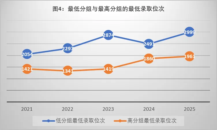 从图3中可看出,北京师范大学最高分组的录取分数线从2022年开始呈下降趋势,而低分组的录取线却呈现了一年高一年低的大小年状况。图4的位次也呈现了相同的趋势。