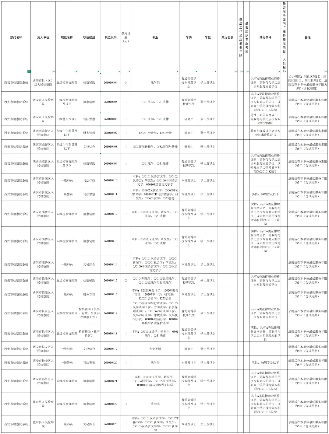 省检察院机关和派出基层院职位表