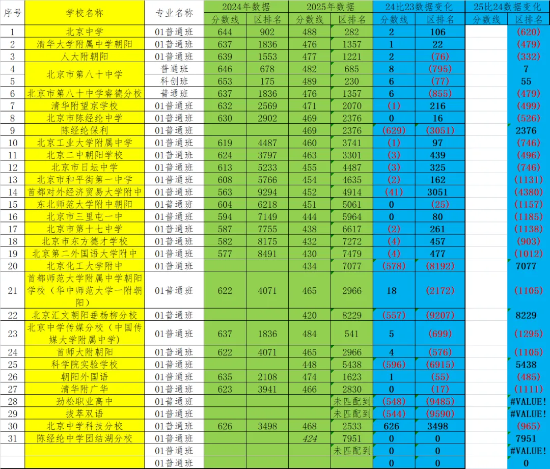 - 朝阳区整体录取位次呈现“普涨”态势,2025年多所学校位次上涨超1000名,反映区域教育质量整体提升及家长择校策略变化。