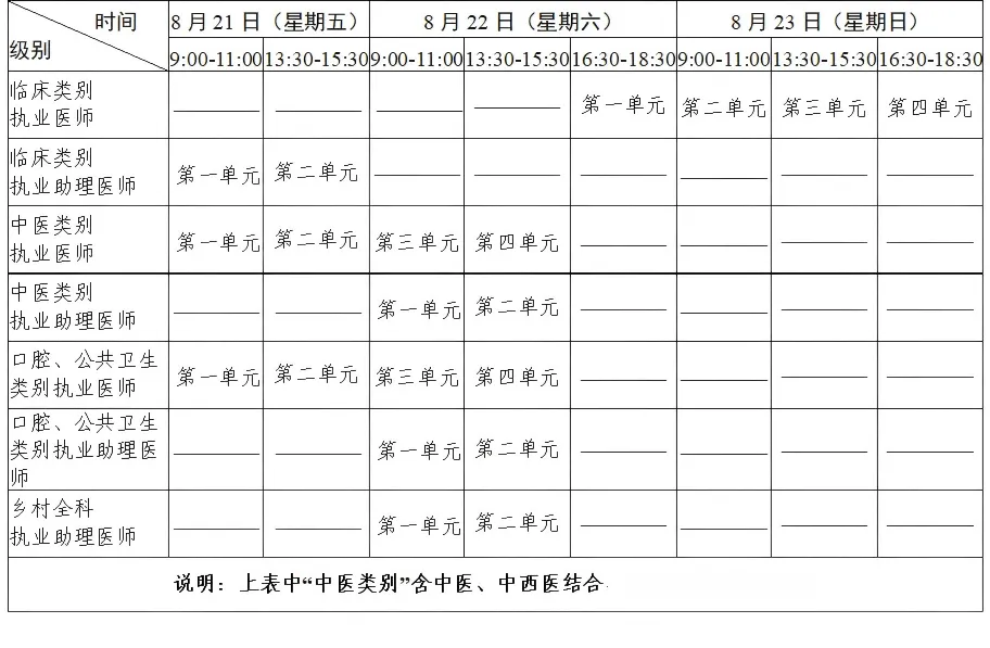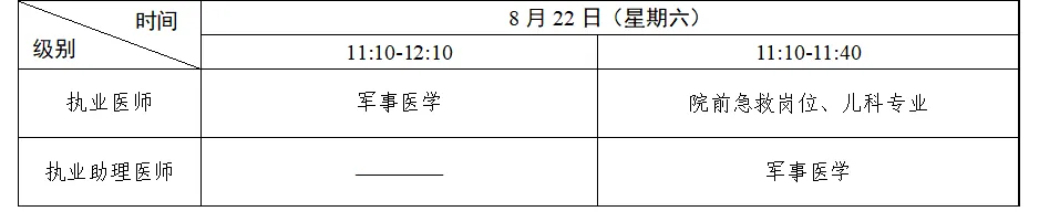 考试实行计算机化考试,军队现役人员、文职人员加试军事医学,院前急救岗位和儿科专业加试相应内容。中医类别蒙医、藏医、维医、哈萨克医专业实行纸笔考试。统一考试时间如下: