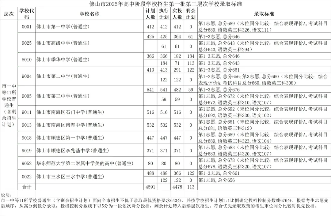 • 第一梯度(全市顶尖):佛山一中、石门中学、顺德一中,正取线680-700分,跨区名额极少,区内考生需稳居年级前5%才有把握,无补录计划。