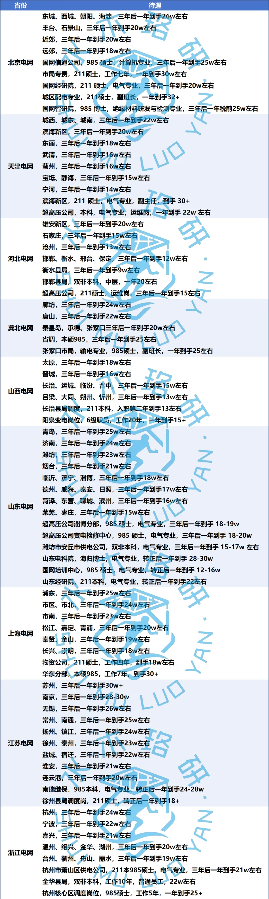 国家电网、南方电网及地方电力公司是电气人的“白月光”。作为旱涝保收的行业顶流,电网的优势在于稳定性和覆盖面:专科到博士均有岗位,但学历直接决定起点——本科生目前基本多分配至不发达区域的县局,不同层级的硕士进不同热门程度的市局,博士可冲击省调或电科院。待遇因地区差异较大,江浙沪粤等经济强省年薪可达15-20W+,西部省份略低但性价比突出。以下是国家电网部分地市局工资名单: