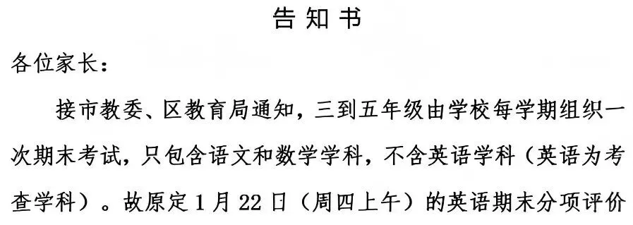 这份突如其来的告知书明确写道:"接市教委、区教育局通知,三到五年级由学校每学期组织一次期末考试,只包含语文和数学学科,不含英语学科(英语为考查学科)。故原定1月22日(周四上午)的英语期末分项评价取消。"