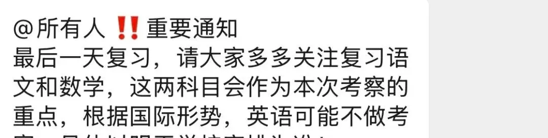 有家长晒出班级群聊截图,称"根据国际形势,英语可能不做考察";也有传言称取消源于家长投诉,而投诉理由更是千奇百怪:有说孩子英语考砸后被家长打骨折,家长愤而到校维权;还有传言称有学生扬言"考英语就自杀",学校为规避风险只能取消考试。这些说法真假难辨,截至目前尚未得到官方证实。