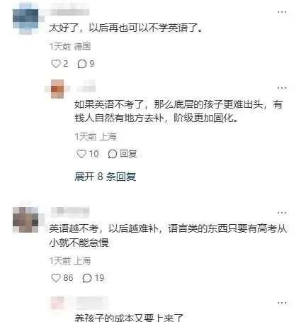 有家长直言:"英语越不考,以后越难补,语言类学科只要高考还考,从小就不能怠慢。"更有家长担忧:"学校考试取消后,会倒逼家庭条件好的家长疯狂找家教、报培训班,抢占优质课外资源,而普通家庭孩子只能依靠学校教学,没了统一考核标准,很容易失去学习方向,最终导致差距越拉越大,阶级更加固化。"