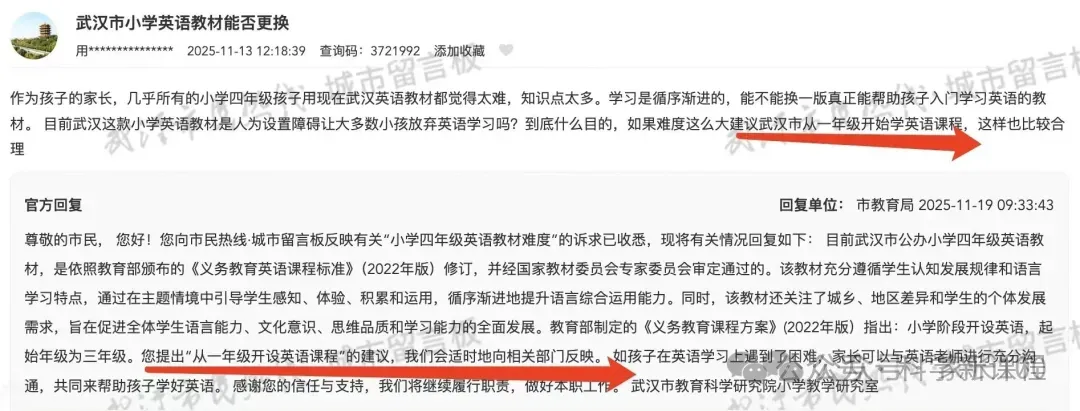 对此,武汉市教育局官方回应称:"目前武汉市公办小学四年级英语教材,是依据教育部颁布的《义务教育英语课程标准》(2022年版)修订,并经国家教材委员会专家委员会审定的。教材遵循学生发展规律和语言学习特点,通过主题情境引导学生感知、体验、积累和运用,循序渐进提升语言综合运用能力,同时关注城乡、地区差异和学生个体发展需求。"对于家长提出的"从一年级开设英语课程"的建议,官方表示会向相关部门反映,并建议家长若孩子学习遇困可与英语老师充分沟通。