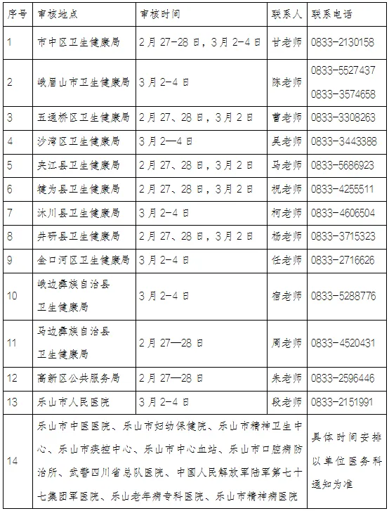 考生医疗机构所在的县(市、区)卫生健康局、乐山高新区公共服务局和各有关医疗机构(下表第13和14所列医疗机构)。