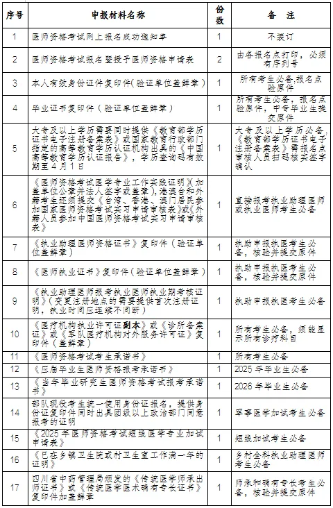 考生根据个人报考情况按要求提交以下材料。材料按照序号顺序装订整齐。复印件要求完整、清楚,提交的复印件一律使用A4纸张,其原件均由所在的医疗机构及各报名点核验,并在复印件上加盖所在医疗机构公章。