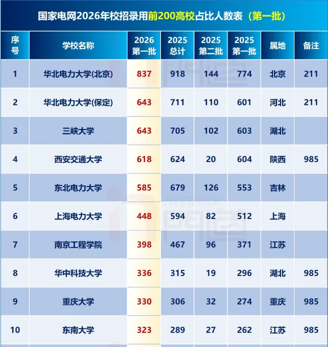 1、2026届国网一批录取中,共有25所985院校跻身Top100。西安交通大学以523人遥遥领先,重庆大学、华中科技大学、东南大学等6校录用人数也突破200人,传统电气强校的行业优势凸显。