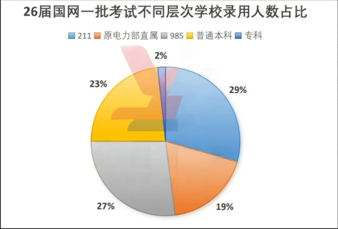 值得注意的是,中国农业大学、北京大学等非传统电气强校也在榜单中,反映出国网招聘既看重学科实力,也认可 985 院校的综合培养质量。结合饼图数据,985院校整体占比达27%,既是顶尖高校品牌实力的体现,也为非电气专业的高层次人才提供了进入电力行业的通道。
