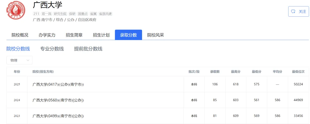 >志愿填报|广西大学2025年在河北省录取分数线及排名(物理、历史)