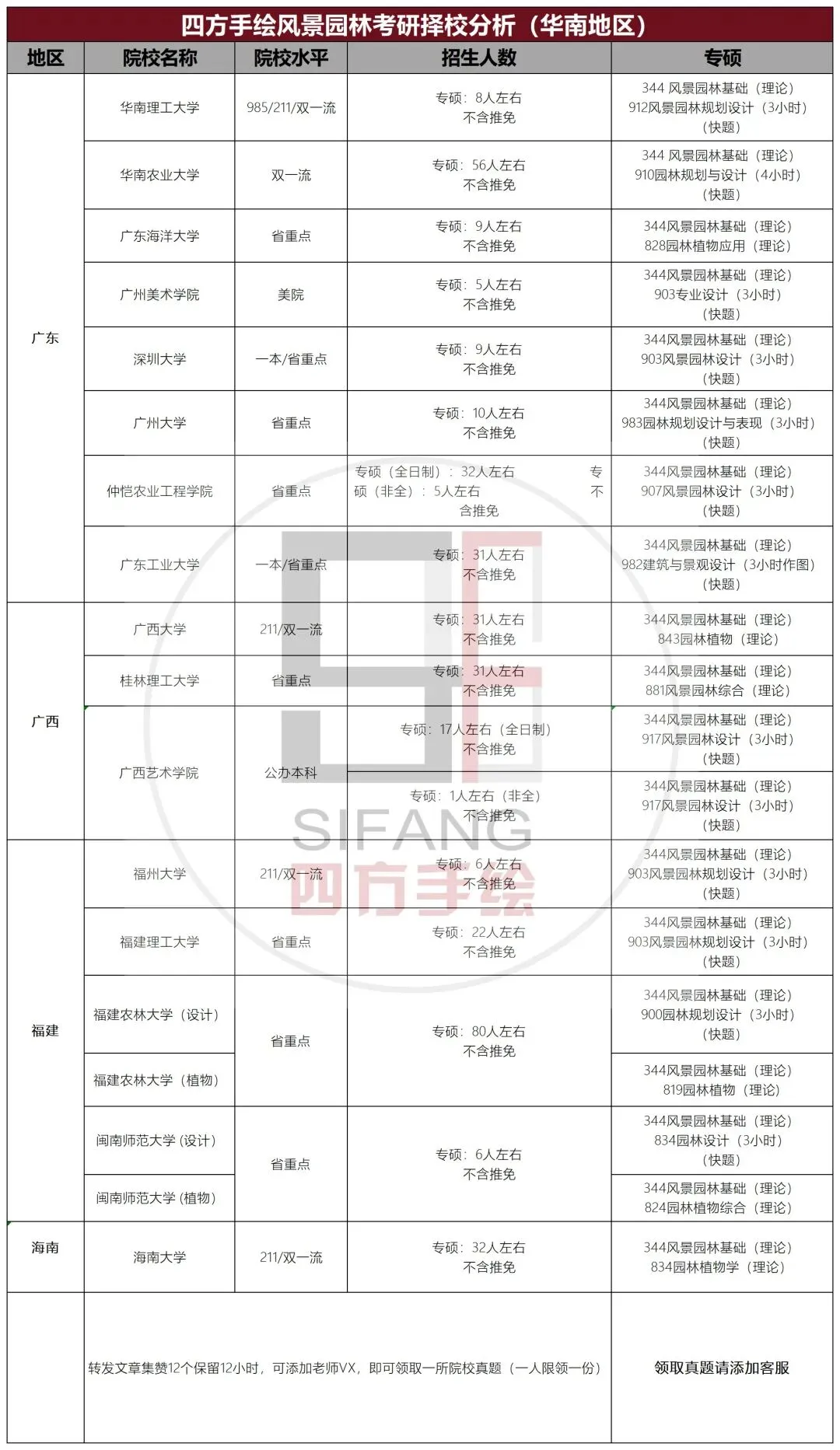 华南地区有2所211+2所双一流院校招生,广西大学、海南大学、华南农业大学、福州大学,考双理论和理论+快题的院校均有,学校学科实力强劲,考察难度适中,值得冲。