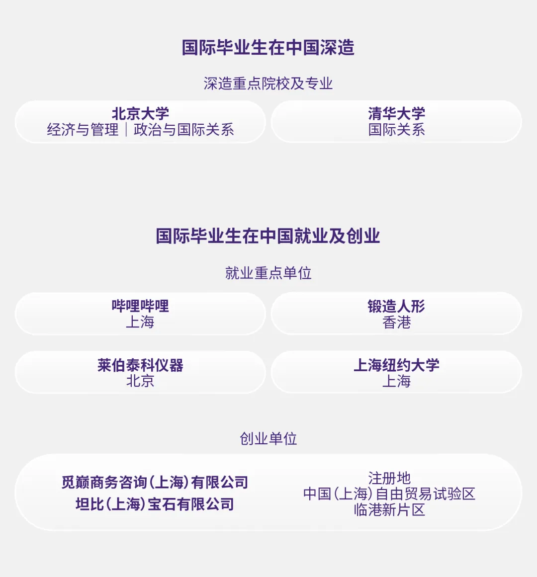 本届共有14位来自美国、印度、英国、巴基斯坦等国的国际学生,选择在中国开启职业或学术新篇章:有人加入头部互联网企业;有人勇敢创业;还有三位学子进入北京大学、清华大学等中国顶尖学府深造。