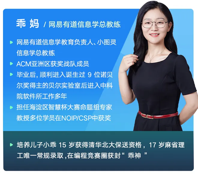 她是网易有道信息学奥赛NOIP的总教练、网易有道信息学教育负责人;