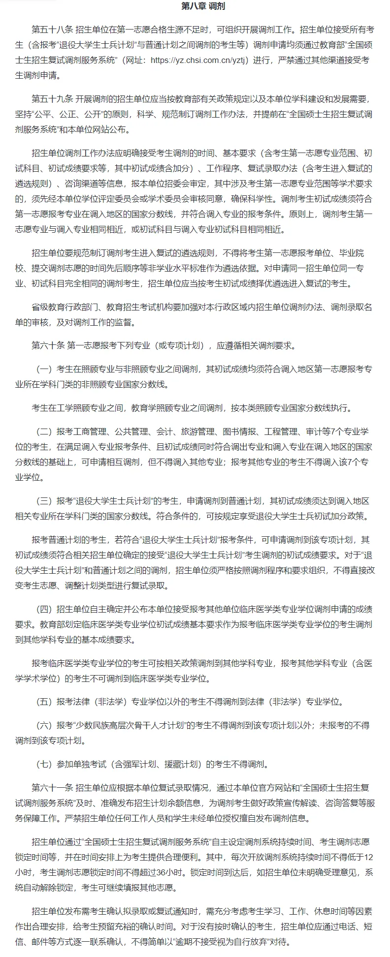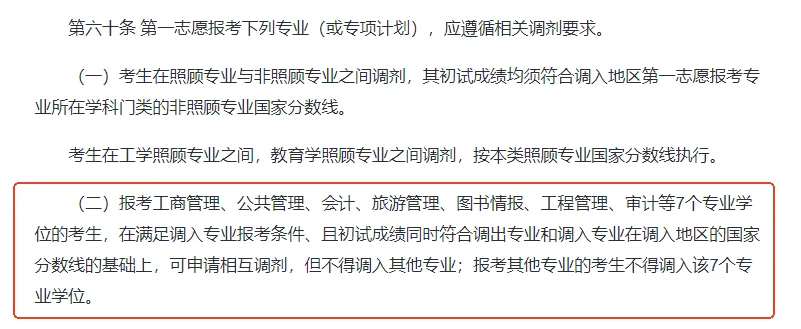 报考工商管理、公共管理、会计、旅游管理、图书情报、工程管理、审计等7个专业学位的考生,在满足调入专业报考条件、且初试成绩同时符合调出专业和调入专业在调入地区的国家分数线的基础上,可申请相互调剂,但不得调入其他专业;报考其他专业的考生不得调入该7个专业学位。