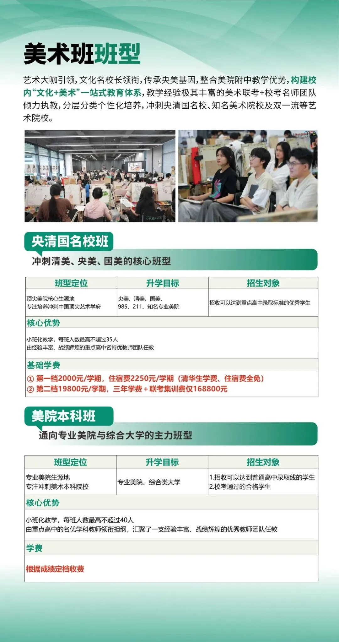 美术班真正实现“美术专业+文化课程”校内全流程一条龙教学的培养模式,文化和美术完美融合,学习更高效,三年整体费用更节省!