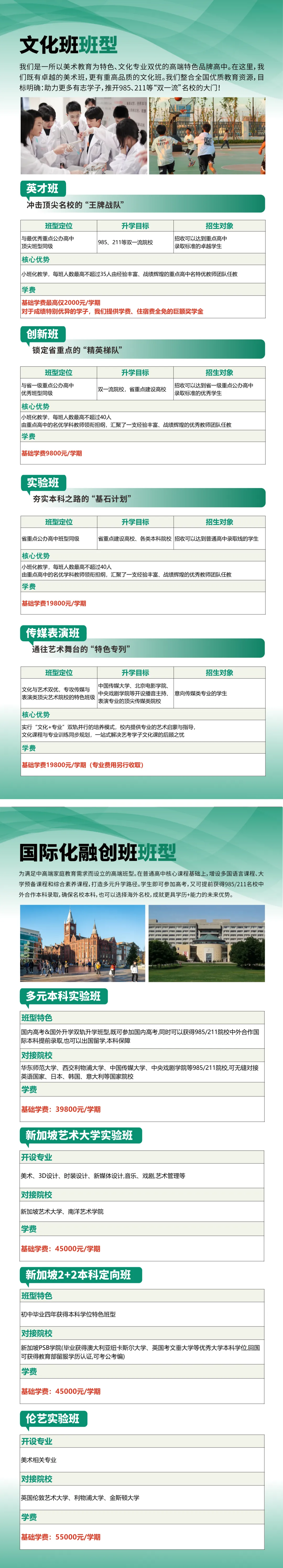 美术班:专业课程包括造型基础、设计基础、中国画基础;文化课程包括浙江省普通高中课程(文科类)。