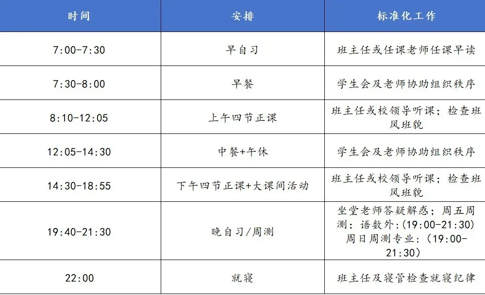 采用科学的管理模式,学生在校期间除周末或特定假期外,不得随意离校。日常作息时间固定,包括早自习、课程学习、晚自习及就寝时间,确保学生有规律的学习和生活节奏。学校配备专职班主任和生活老师,负责监督学生的学习和生活,确保纪律和安全。