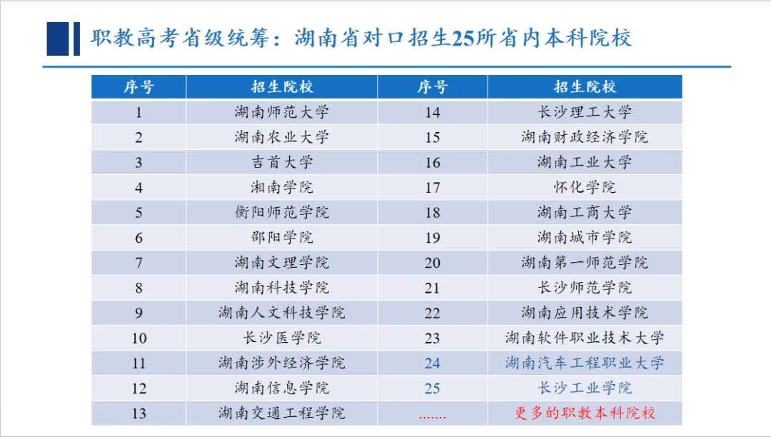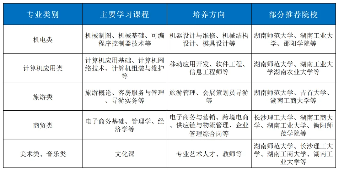 学生在校学习后参加对口高考,报读省内的本科院校或专科院校。可报考:湖南师范大学、湖南农业大学、湖南第一师范学院、湖南工商大学、长沙学院等27所院校。