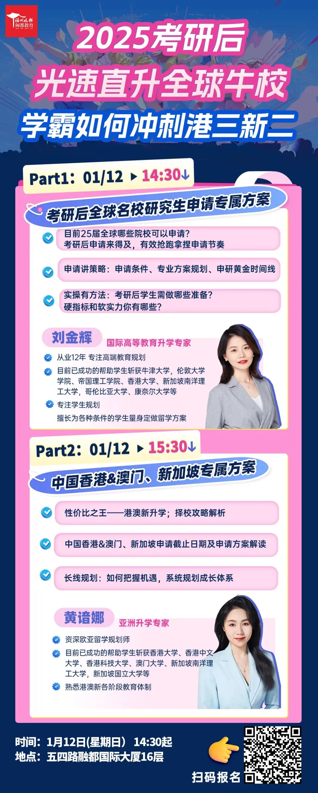 资深专家将为大家讲解考研后海外院校的联合择校预案,同学们、家长们可以根据自己的情况选择合适的国家,再去深入了解和规划。欢迎扫码报名!