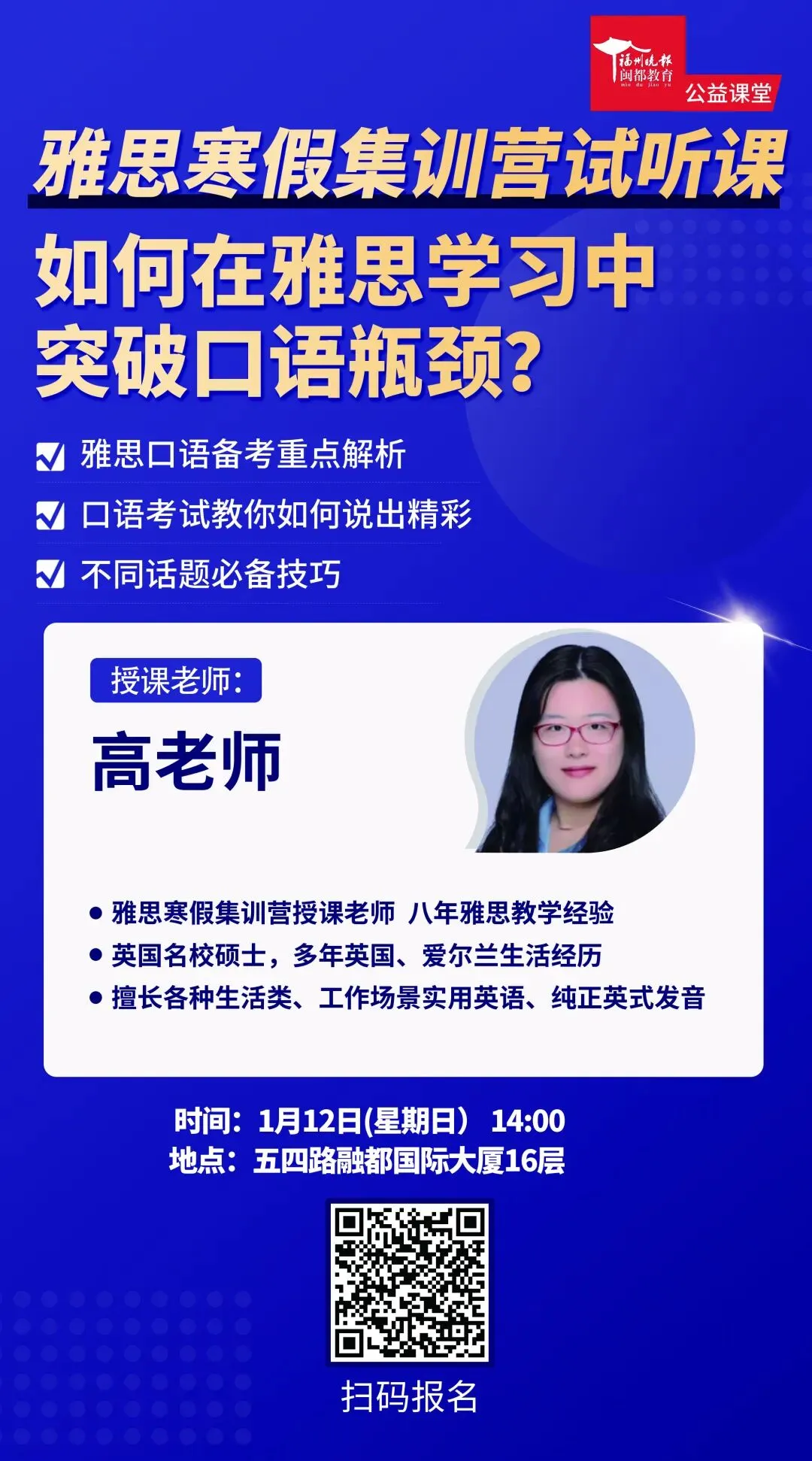 闽都教育“公益课堂”同时联合新通教育,举行一场雅思集训试听课,主题为“如何在雅思学习中突破口语瓶颈”,由福州新通教育资深口语名师主讲。感兴趣的同学欢迎扫码预约。