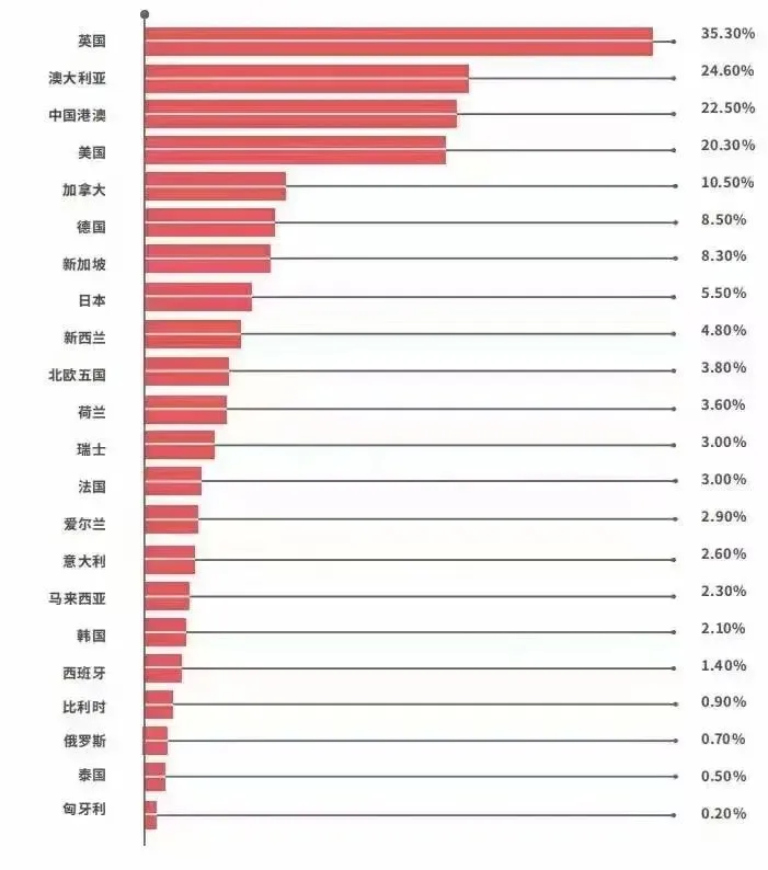 2023年中国学生首选的研究生留学目的地为英国,占比达35.30%;选择到澳洲读研的学生人数增幅明显,位居第二。