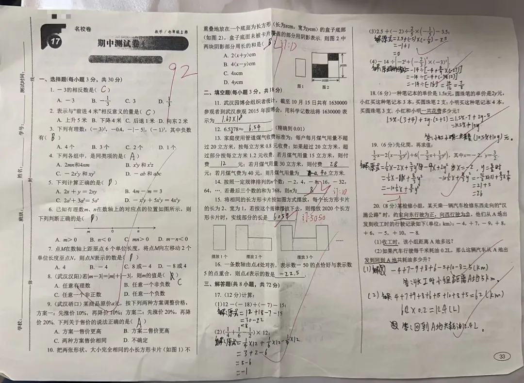 ,孩子妈妈发来期中卷子,92分,满分120分,得分率92/120=76.67%