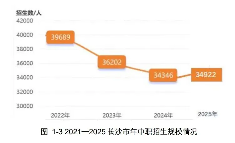 报告显示,2025年长沙共有中职学校52所,其中公办21所、民办31所,全年新招生34922人,较上年增加576人。尽管中职整体招生规模近年呈下降趋势,但今年的小幅回升,已然释放出“职教回暖”的积极信号。