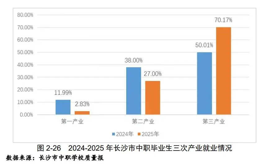对于选择直接就业的中职毕业生,发展前景也同样可期。2025年长沙中职毕业生面向三次产业就业共10287人,其中第三产业(服务业)就业人数达7214人,占比超七成,较上年增长20.16个百分点,契合长沙现代服务业的发展趋势。