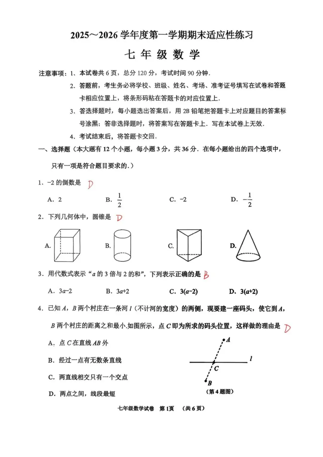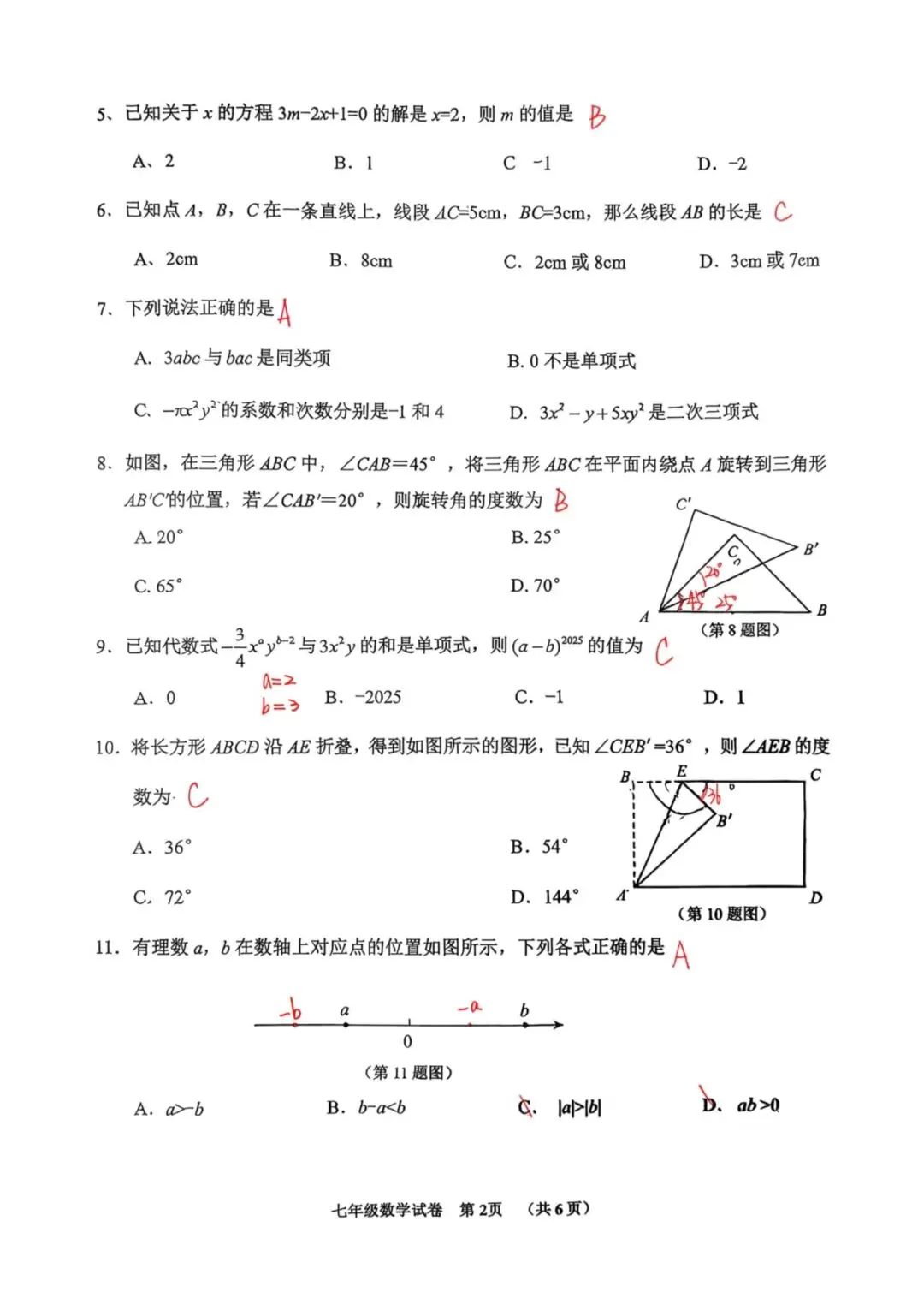 答题亮点:前9小题为基础题,学生得分率较高,尤其是第1-4题、第7题,考查倒数、圆锥识别、代数式表示、同类项概念等基础知识点,绝大多数学生能够准确作答,预计正确率超过80%,说明学生对核心基础概念和简单运算掌握扎实;第5题一元一次方程的解、第6题线段长度计算,多数学生能掌握解题方法,仅少数学生因粗心失分。