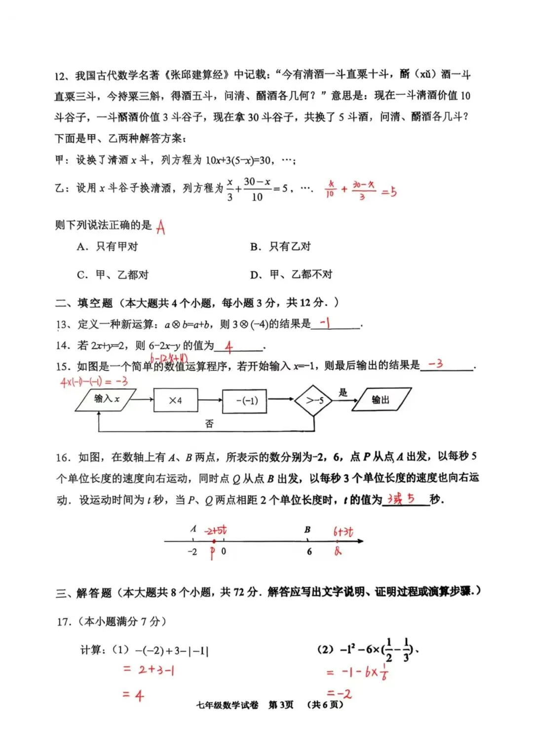 答题亮点:第13题新定义运算(a⊗b=a+b)、第14题代数式整体求值(6-2x-y,结合2x+y=2),学生得分率较高(预计超过75%),多数学生能够准确把握新定义规则和整体代入思想,规范书写答案;第15题数值运算程序,步骤简单,学生能按程序逐步计算,失误较少。
