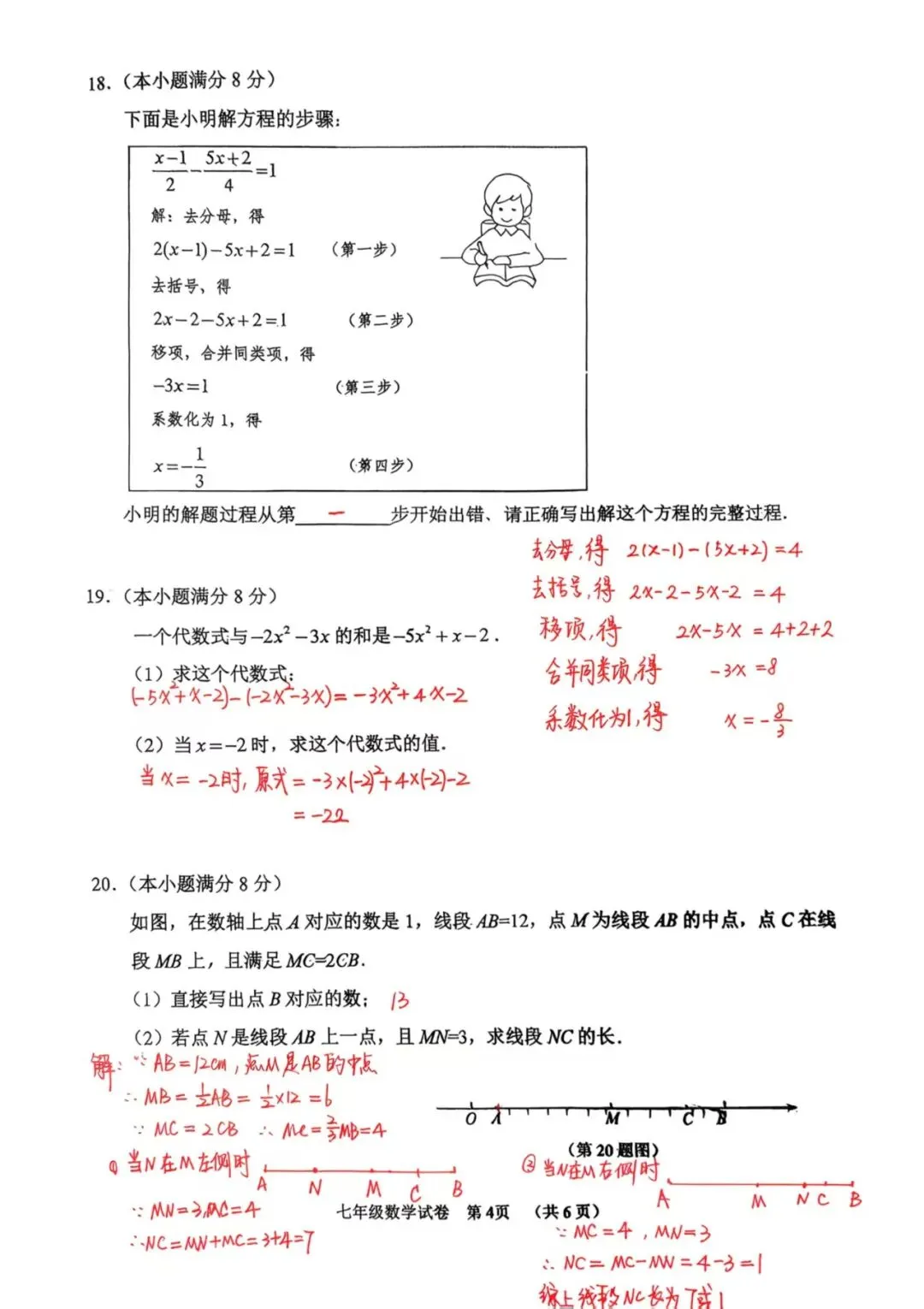 答题亮点:1. 第17题有理数混合运算、第19题整式化简求值,为基础计算题,学生得分率较高(预计超过70%),多数学生能够掌握运算法则和解题步骤,规范书写解题过程,尤其是整式化简中同类项合并、代入求值时符号判断准确;2. 第18题找一元一次方程解题错误并改正,学生能准确识别第一步(去分母时漏乘常数项、括号前是负号未变号)的错误,正确完成解题过程,步骤书写较规范;3. 第20题(数轴线段计算)第一问,学生能快速求出点B对应的数,得分率较高,体现出对线段中点性质的掌握扎实。