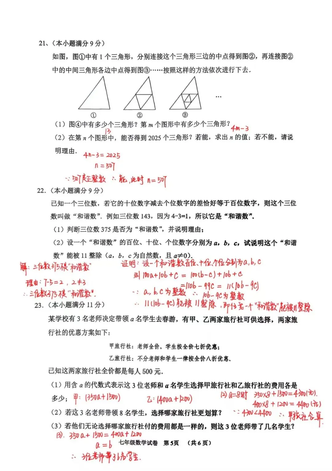 存在问题:1. 运算能力薄弱,部分学生在第17题有理数混合运算中,混淆运算顺序(先乘方后乘除再加减)、符号判断错误(如-1²误算为1),整式化简中合并同类项失误,导致基础计算题失分;2. 解题步骤不规范,如第18题改正方程时,未注明“去分母”“去括号”“移项”等步骤,第21题、22题探究题中,未写出推理过程和理由,仅直接写出答案,导致过程分丢失;3. 实际应用能力不足,第23题(旅行社费用)中,部分学生无法准确用含a的代数式表示两家旅行社的费用,尤其是乙旅行社的费用计算失误,第(2)(3)问中,代入计算时粗心,无法准确比较费用高低、求解方程;4. 综合推理能力欠缺,第22题(和谐数)第二问,学生无法将三位数表示为100a+10b+c,结合“a=b-c”进行代数变形,证明其能被11整除,推理逻辑混乱;第24题(三角板旋转),尤其是第(3)问,学生无法结合角平分线的性质,分类讨论旋转角α的不同情况,多数学生仅写出部分答案,得分率极低;5. 思维拓展能力不足,第21题(图形规律)中,学生无法总结出“第n个图形有4n-3个三角形”的规律,第(2)问中解方程时计算失误,无法判断能否得到2025个三角形;6. 难题(第23题第(3)问、第24题)得分率极低,多数学生无从下手,反映出学生的思维拓展能力和知识综合运用能力有待提升。