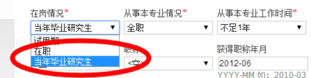 l需要注意获取职称年月的格式 YYYY-MM 如 2008-03。l在岗情况一项中,以研究生学历报考的考生应注意,若本人为当年毕业研究生,尚未获取毕业证书,此处需要选择为“当年毕业研究生”。-若用户获取有职务,职称等信息请予以准确填写,这将有利于为您提供更加详尽的成绩分析服务。4. 教育经历和培训经历