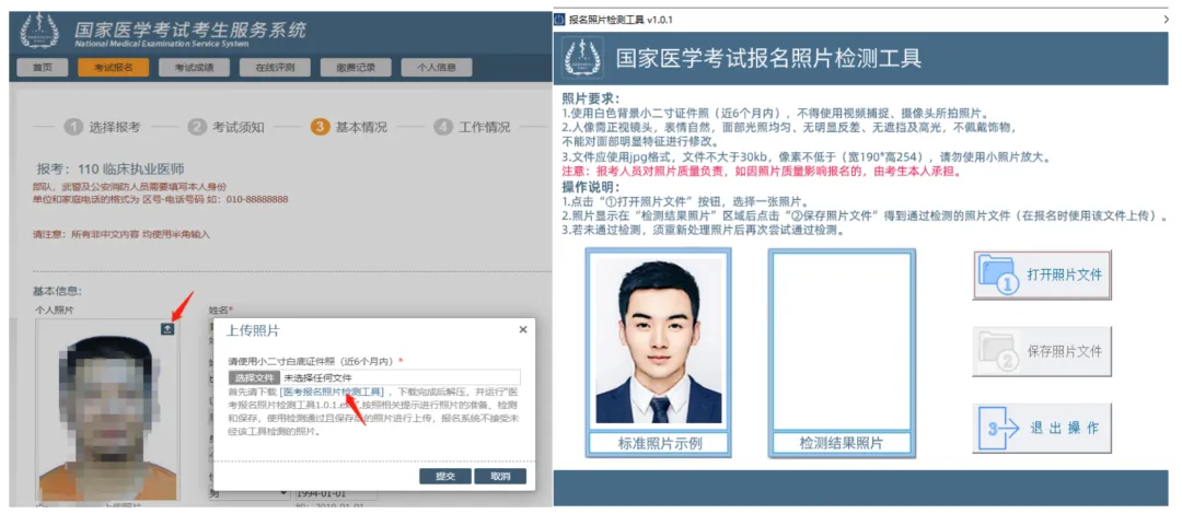 2021年起,考生网上报名前,先按要求准备近期(6个月内)小2寸白底证件照,文件小于30kb,格式为jpg。报名上传照片前须通过「医考报名照片检测工具」(下载地址在上传照片界面处提示,如下图)进行检测处理。检测过程请严格按页面说明操作,检测通过后保存,登陆国家医学考试考生服务系统报名时上传,报名系统不接受未经该工具检测的照片。请广大考生提前准备,以免影响考试报名。注意:个别使用旧照片时,经检测工具检测后会超30K的情况,请用微软自带的画图软件打开,不做任何操作,直接保存后查看其真实文件大小,适当按比例缩小后再用检测工具检测,直到保存后的文件大小小于30K。报名成功后,打印《医师资格考试网上报名成功通知单》(如报名成功后进行信息修改的,须重新提交并重新打印报名成功通知单,原网上报名成功通知单无效)