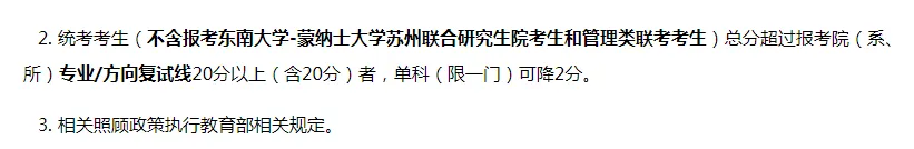 东南大学24考研也有相关的政策,总分超复试线20分及以上者,可允许一门单科比复试线低2分。
