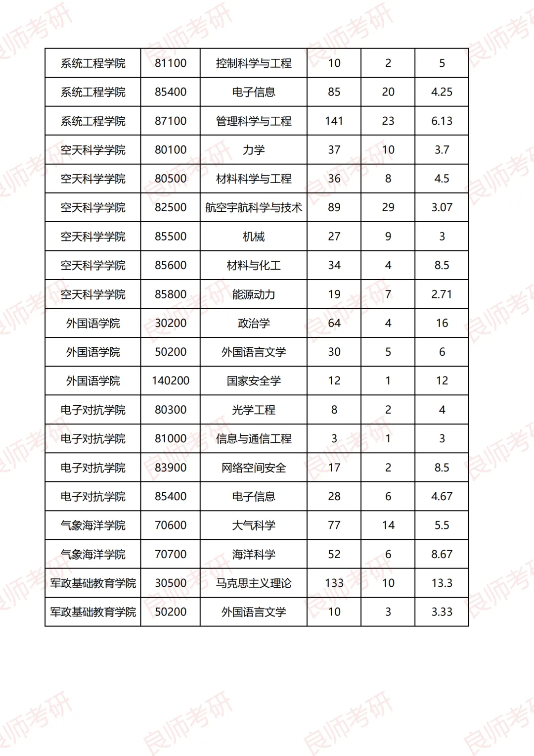 考录比最低的是为空天科学学院的能源动力专业,19人考试,录取7人。第二低的是理学院的力学专业,14人考试,录取5人;第三低的是电子对抗学院的信息与通信工程和空天科学学院的机械,其考录比为3。