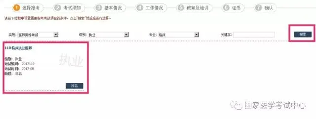 选择需要报考的项目,我们以医师资格考试临床执业医师为例,在下方的类别中,选择医师资格考试,级别选择执业,专业选择临床,然后点击搜索,下方将显示考试项目,确认是自己报名的考试项目后,点击报名按钮。