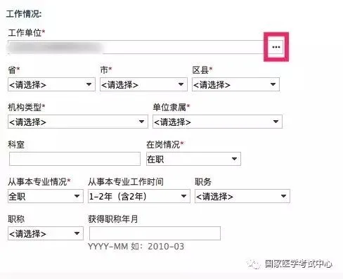 工作情况,点击右侧的三个圆点按钮,从工作单位列表中,选择自己所在的工作单位,确认无误后,点击确定,然后将单位的所在地区、机构类型、单位隶属以及在岗情况等标有红色星号的内容,按照实际情况填写完整,下方的职务、职称情况如果没有可不用填写,再次核实无误后,点击下一步。
