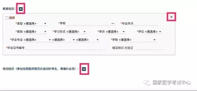 教育及培训经历,这里的学校名称同样是点击右侧的三个圆点按钮,从学校列表中搜索并选择自己所在的学校,选择完成后,我们建议根据毕业证书上的内容将其他信息填写完整,如果有多个教育经历的,点击教育经历旁的加号按钮,可增加一条新的教育经历,如果需要删除教育经历,也可点击右上角的X按钮,全部填写完成后,勾选左上角的复选框,选择一个符合报考条件的学历作为本次医师资格考试的教育经历。特别注意: